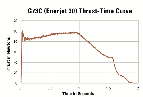 The G73C features AeroTech's Classic'' propellant formulation producing 128.64 N-Sec (28.91 lb.-Sec.) of total impulse with a burn time of 1.85 seconds and total weight of 127g (0.27 lbs.). This is a great all-around "G" size rocket motor delivering impressive lift-offs with visible supersonic Mach diamonds. The 62g (0.13 lbs.) of AeroTech's Classic propellant produces a translucent exhaust plume and no smoke, appearing to make your rocket leap off the launch pad with a peak thrust of 89.90 N (20.21 lbs.) and an average thrust 69.32 N (15.58 lbs.).