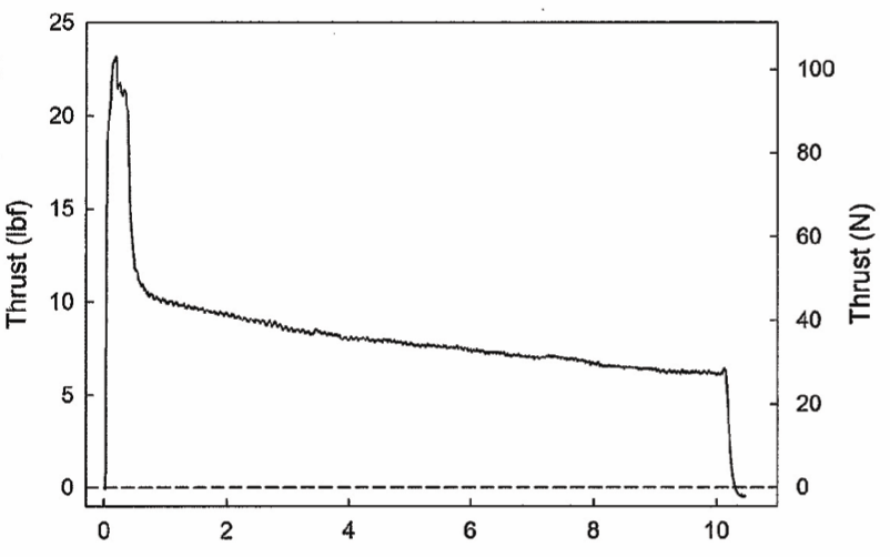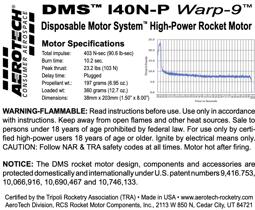 The I40N-P is a long-burn, high-performance rocket motor intended for large gliders and lightweight vertical trajectory rockets for flights to high altitudes. It delivers 374.9 N-Sec (84.3 lb.-Sec.) of total impulse with an impressive 10.0 second burn time and a total weight of 12.7 oz. (359.9 g). This new rocket motor utilizes 7.0 oz. (197.0 g) of AeroTech’s aerospace-grade Warp-9™ (N) propellant formulation with a core-modified end-burner design. Displaying a yellow-orange flame studded with "mach diamonds", Warp-9 is AeroTech's fastest-burning propellant. Warp-9 is perfect when you need the highest thrust possible or when you have an end-burner requiring a high initial thrust with a steady and strong sustained thrust. The I40N-P generates a peak thrust of 101.9 N (22.9 lb.) with an average thrust of 37.8 N (8.5 lb.). The I40N-P is a plugged motor that does not produce delay smoke or an ejection charge, requiring the use of an electronically-activated recovery system.