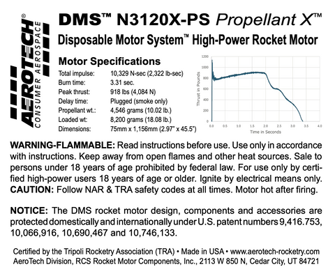The N3120X-PS (P/N 14310P) motor uses AeroTech’s high-Isp Propellant X™ to produce an exceptionally high total impulse, accompanied by a bright white flame with a moderate amount of smoke. The motor delivers 10,329 N-sec (2,322 lb. sec) of total impulse in 3.3 seconds making it ideal for extreme high-altitude attempts (including two-stage flights to the edge of outer space!) and sport flights in heavy weight rockets. The N3120X-PS is a “plugged” motor that produces tracking smoke only, and cannot be configured with an integral ejection charge. Rockets using 75 and 98mm DMS motors must utilize an electronically-activated recovery system.