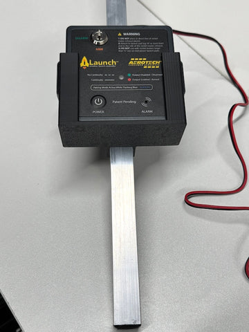 The iLaunch Mount for the Mantis Launch Pad retains the new iLaunch wireless launch controller control box on the Mantis. The mount is made of 3D printed ABS plastic and securely slips over one of the Mantis' aluminum legs, to keep the iLaunch control box off the ground and out of the path of the rocket motor's exhaust. The iLaunch power button and arm/disarm key switch remain accessible and the status light and buzzer/alarm port easily visible. A must-have accessory for all Mantis launch pad owners!