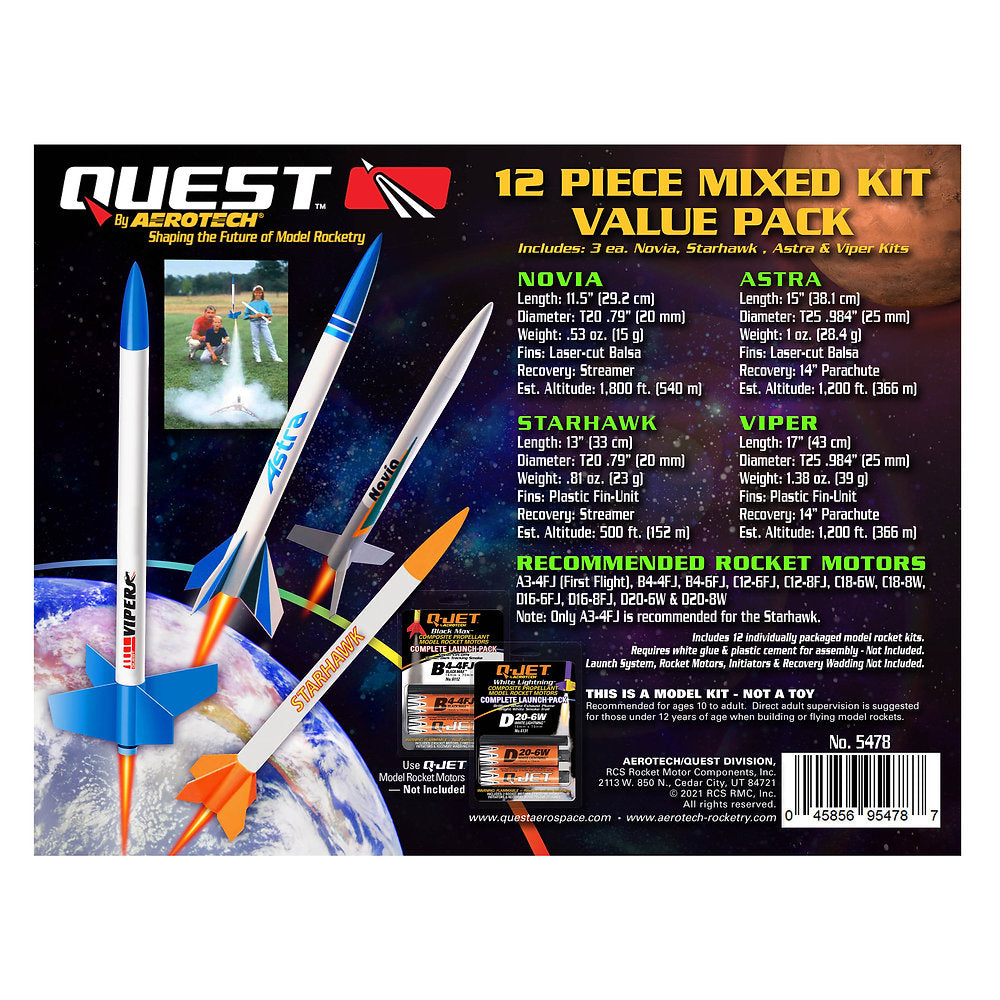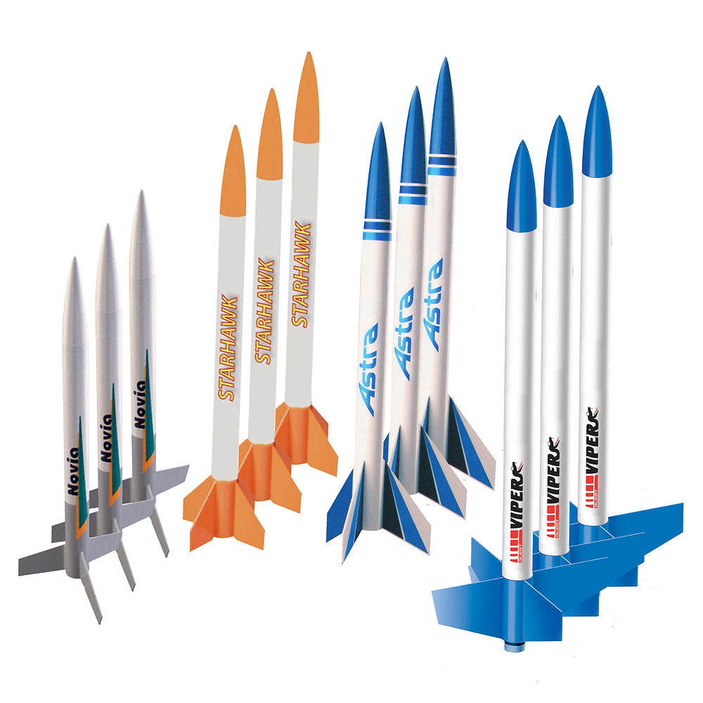 The Mixed Rocket Classroom Value Pack of 12 rockets (3 each of Novia, Starhawk, Astra, & Viper) are perfect for schools, camps, clubs and youth group programs including the Civil Air Patrol, 4H, Starbase and Scouting’s Space Exploration Merit Badge requirements.