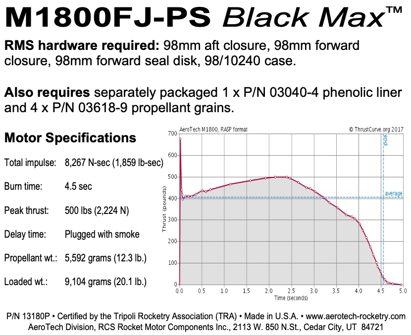 This RMS motor reload utilizes RCSs exclusive Black Max™ aerospace grade composite propellant formulation, which produces a visible black exhaust plume and a denser dark tracking smoke. Black Max™ motors provide a higher level of thrust than White Lightning™ motors of the same total impulse and are perfect for high lift-off acceleration.