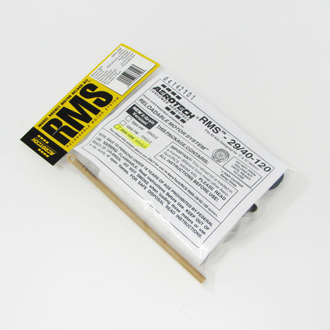 The AeroTech Reloadable Motor System RMS is an aluminum cased reusable motor in kit form that is assembled by the user. You will need AeroTech RMS-29/40-120 motor hardware to build and complete the motor for many reliable flights. Motor hardware is available separately in a complete set, and also as individual parts. Important: Mid Power RMS reload kits are not compatible with High Power RMS products. This RMS motor reload utilizes RCSs exclusive White Lightning™ aerospace grade composite propellant formulation, which produces a gorgeous bright white flame with lots of dense white smoke and a throaty roar at lift-off.