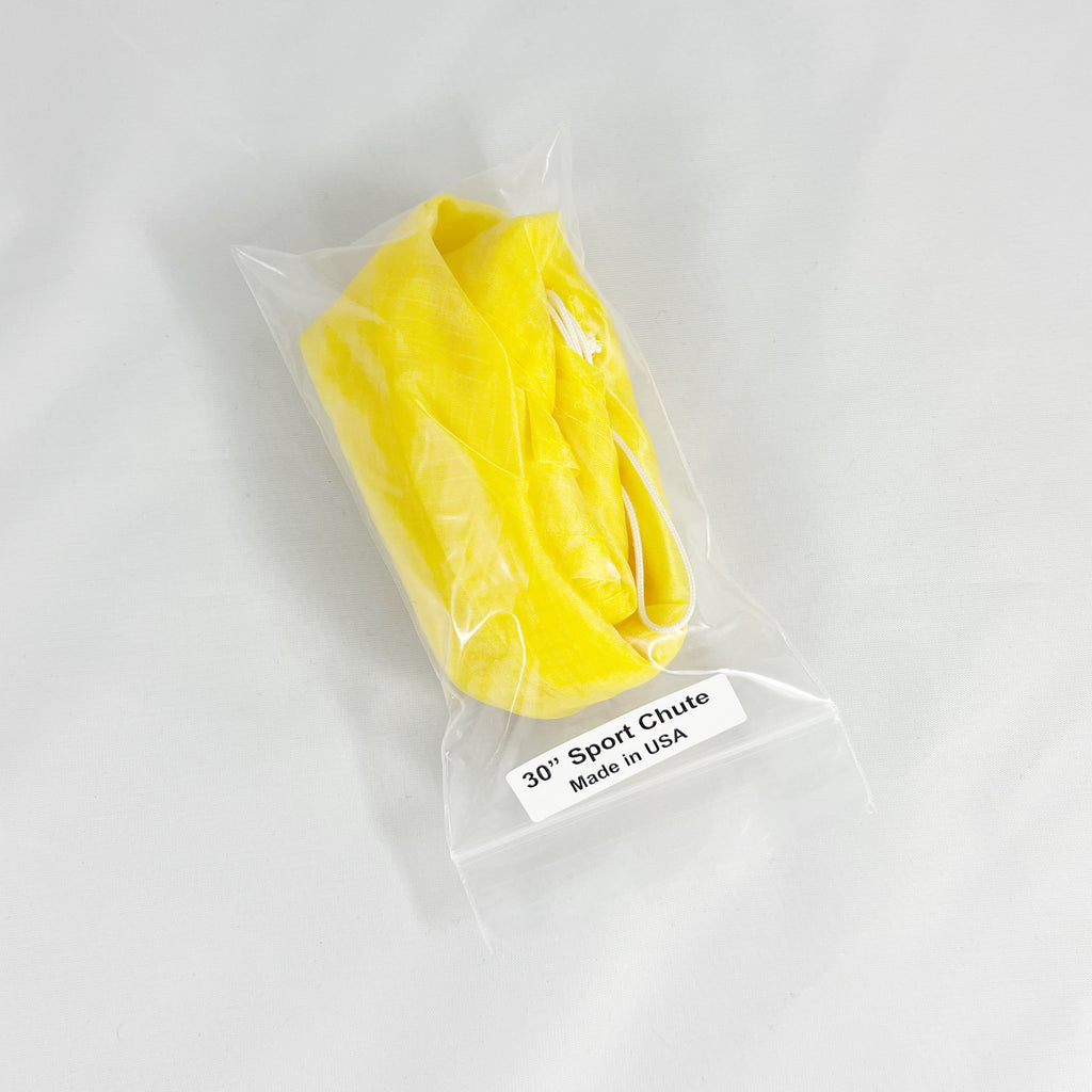 The same parachute that is supplied with AeroTech rocket kits. Pre-assembled sewn yellow rip-stop nylon with shroud lines attached.