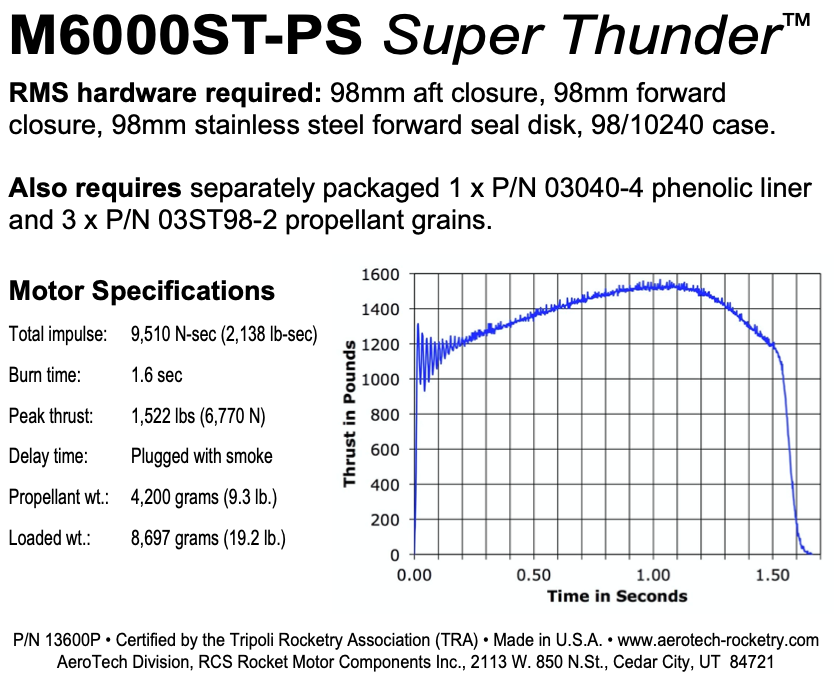 This RMS motor reload utilizes RCSs exclusive Super Thunder™ aerospace grade composite propellant formulation, which produces a bright violet-blue flame with a minimum of exhaust smoke. Super Thunder™ motors provide a higher ISP than Blue Thunder™.