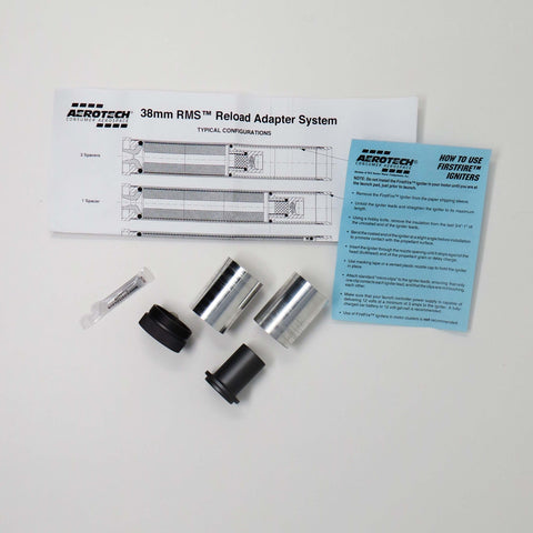 For use with all AeroTech RMS-38 high power motor reload kits. Includes two 38mm case spacers (38FCCS), one 38mm floating forward closure (38FFC) and one 38mm forward closure retaining ring (38FCRR). Motor reloads sold separately. Important: High Power RMS reload kits are not compatible with Mid Power RMS products.