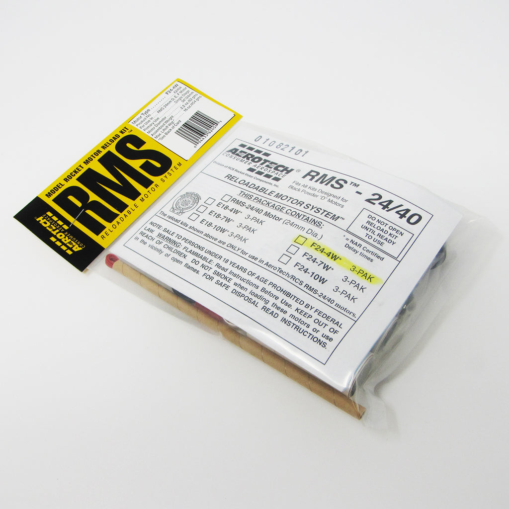 The AeroTech Reloadable Motor System RMS is an aluminum cased reusable motor in kit form that is assembled by the user. You will need AeroTech RMS-24/40 motor hardware to build and complete the motor for many reliable flights. Motor hardware is available separately in a complete set, and also as individual parts. Important: Mid Power RMS reload kits are not compatible with High Power RMS products. This RMS motor reload utilizes RCSs exclusive White Lightning™ aerospace grade composite propellant formulation, which produces a gorgeous bright white flame with lots of dense white smoke and a throaty roar at lift-off.