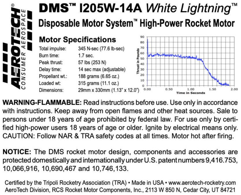 DMS motors feature a filament-wound fiberglass casing, a glass-reinforced composite phenolic nozzle, a molded plastic bulkhead and RCSs exclusive White Lightning™ aerospace grade composite propellant formulation, which produces a brilliant white flame with lots of dense white smoke and a throaty roar at lift-off.