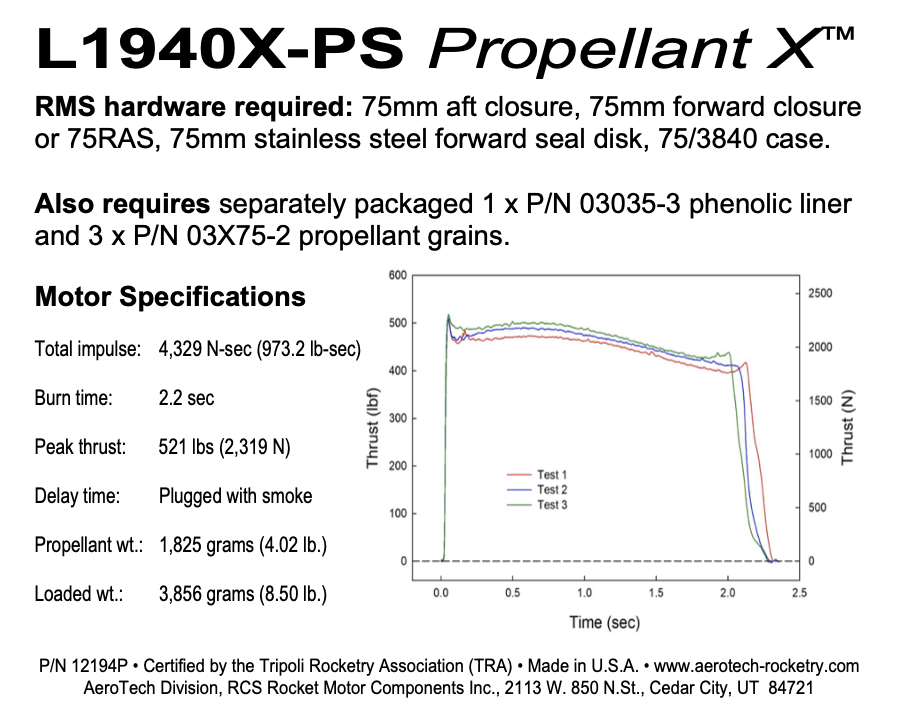 This RMS motor reload utilizes RCSs exclusive Propellant X™ aerospace grade composite propellant formulation, which is a high ISP propellant, and produces a bright white flame with a moderate amount of smoke.