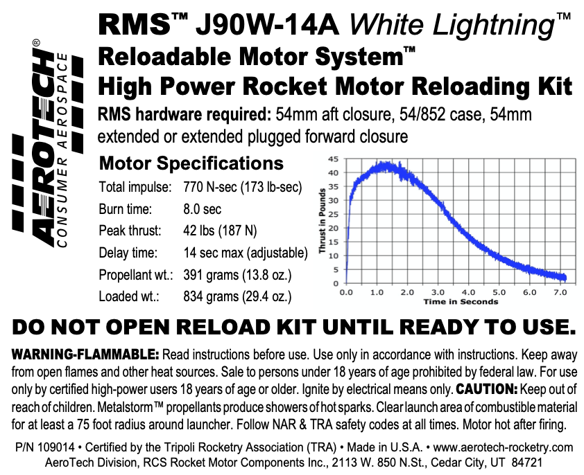 This RMS motor reload utilizes RCSs exclusive White Lightning™ aerospace grade composite propellant formulation, which produces a gorgeous bright white flame with lots of dense white smoke and a throaty roar at lift-off.