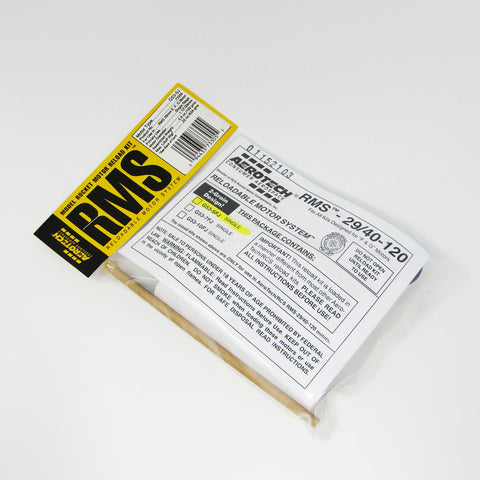 The AeroTech Reloadable Motor System RMS is an aluminum cased reusable motor in kit form that is assembled by the user. You will need AeroTech RMS-29/40-120 motor hardware to build and complete the motor for many reliable flights. Motor hardware is available separately in a complete set, and also as individual parts. Important: Mid Power RMS reload kits are not compatible with High Power RMS products. This RMS motor reload utilizes RCSs exclusive Black Max™ aerospace grade composite propellant formulation, which produces a visible black exhaust plume and a denser dark tracking smoke. Black Max™ motors provide a higher level of thrust than White Lightning™ motors of the same total impulse and are perfect for high lift-off acceleration.