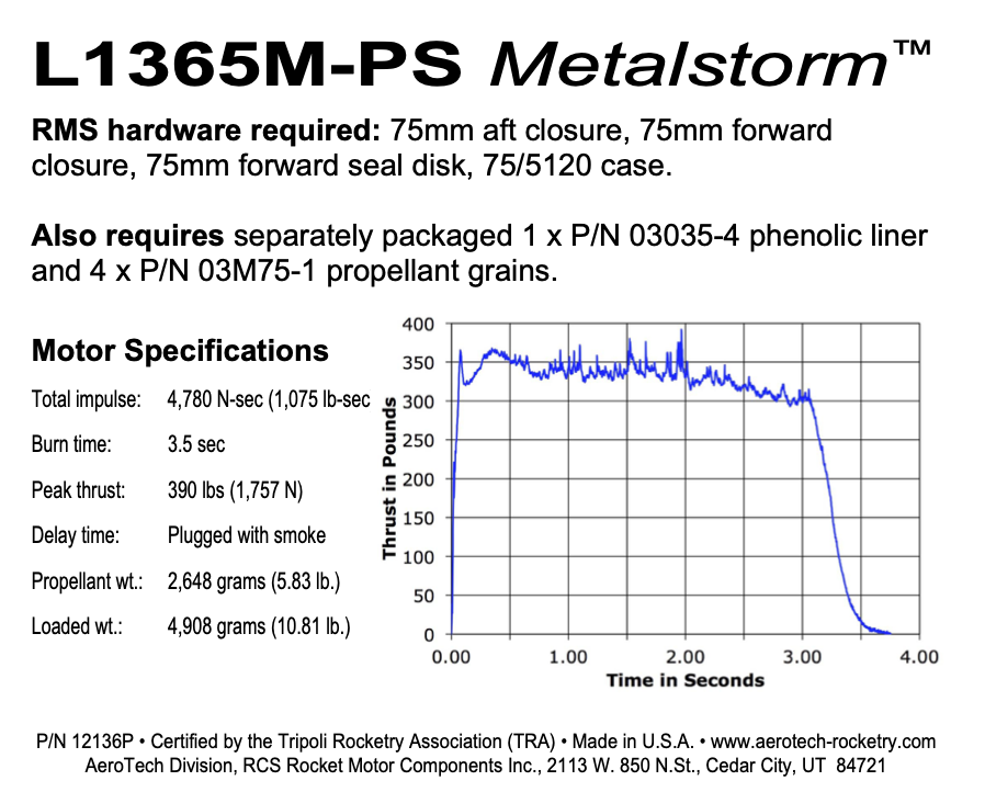 This RMS motor reload utilizes RCSs exclusive Metalstorm™ aerospace grade composite propellant formulation. Metalstorm™ is a sparky propellant, lights easily and produces a large brilliant white exhaust plume, a long yellow-orange dense spark trail, and plentiful white sparks that fan out in flight. As with all rocket motors using spark-generating propellants, special precautions must be taken to avoid fires around the launch pad by clearing the immediate area of all combustible materials in accordance with applicable fire and safety codes.
