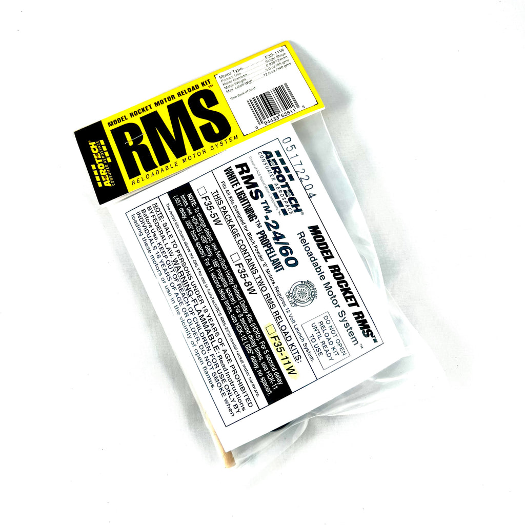 The AeroTech Reloadable Motor System RMS is an aluminum cased reusable motor in kit form that is assembled by the user. You will need AeroTech RMS-24/60 motor hardware to build and complete the motor for many reliable flights. Motor hardware is available separately in a complete set, and also as individual parts. Important: Mid Power RMS reload kits are not compatible with High Power RMS products. This RMS motor reload utilizes RCSs exclusive White Lightning™ aerospace grade composite propellant formulation, which produces a gorgeous bright white flame with lots of dense white smoke and a throaty roar at lift-off.