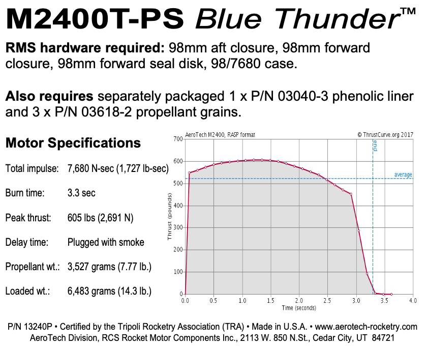 This RMS motor reload utilizes RCSs exclusive Blue Thunder™ aerospace grade composite propellant formulation, which produces a gorgeous bright violet-blue flame with a minimum of exhaust smoke. Blue Thunder™ motors provide a higher level of thrust than White Lightning™ motors of the same total impulse and are perfect for high lift-off acceleration.