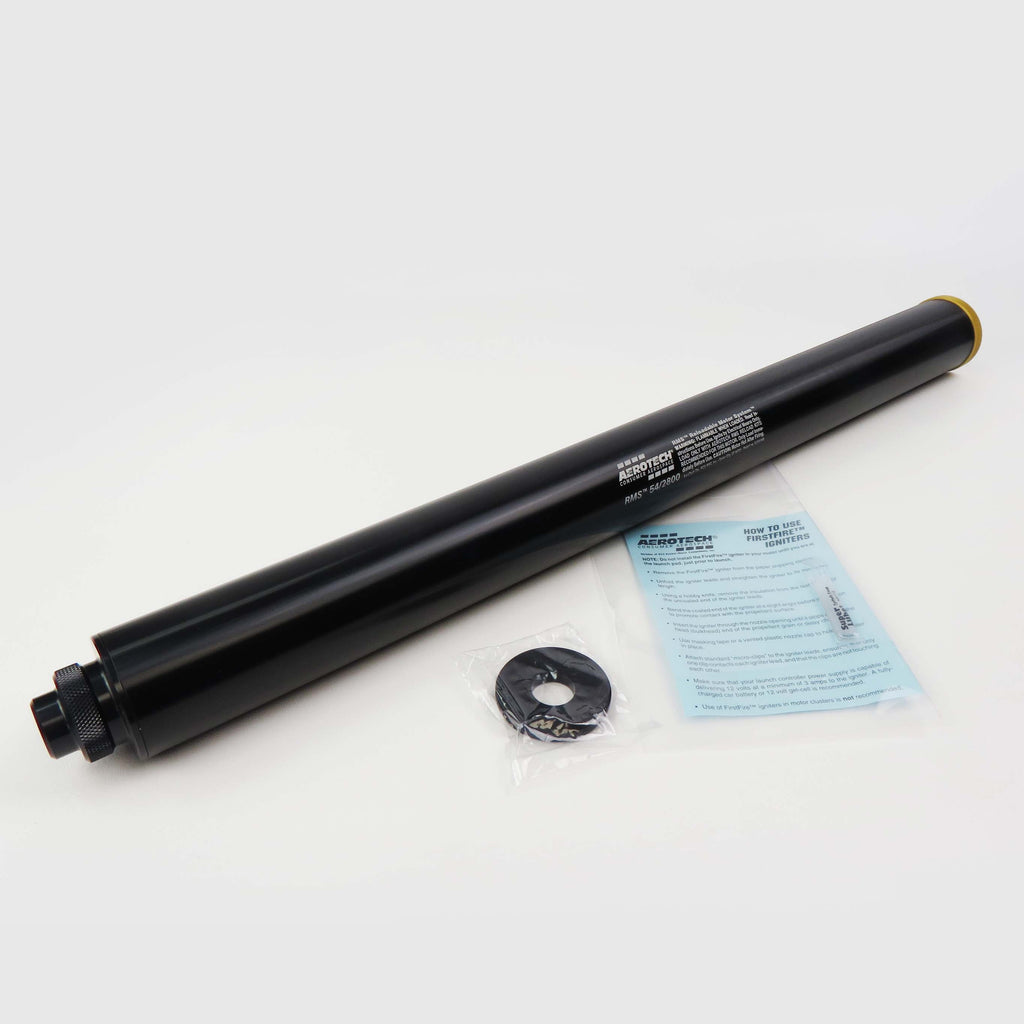 For use with all AeroTech RMS-54/2800 high power motor reload kits. This reusable AeroTech RMS-54/2800 motor hardware set includes the aluminum motor case, motor forward closure, forward seal disc, motor aft closure, and a 1cc tube of the Super-Lube grease for assembly. Motor reloads sold separately. Important: High Power RMS reload kits are not compatible with Mid Power RMS products.