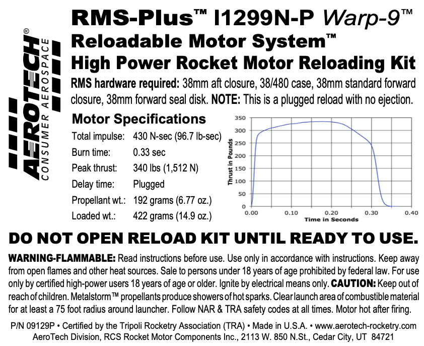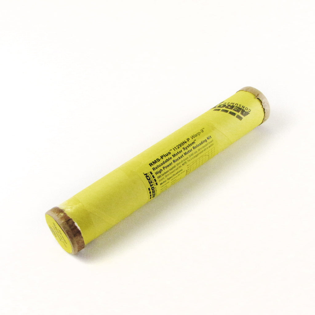 This RMS motor reload utilizes RCSs exclusive Warp-9™ aerospace grade composite propellant formulation, which produces a prominent yellow-orange flame studded with “mach diamonds.” Warp-9 is AeroTech’s fastest burning propellant. Originally developed for Orbital’s Pegasus® fin motors, Warp-9 is perfect when you need the highest thrust possible from a given motor size.