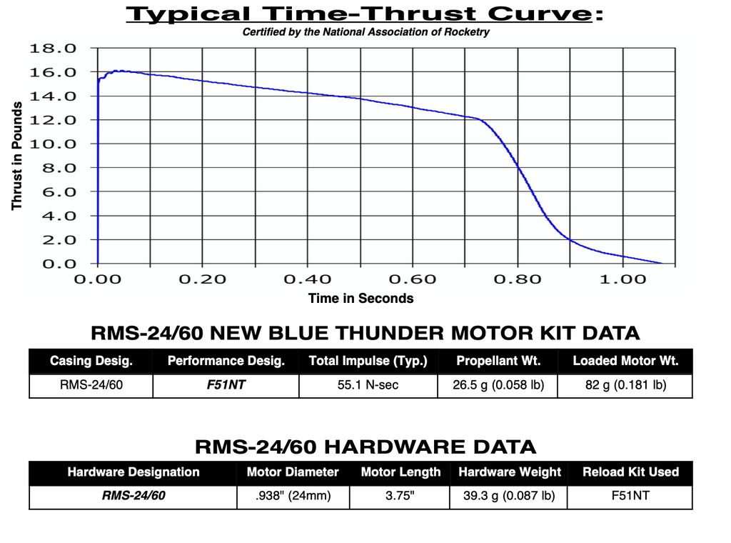 The AeroTech Reloadable Motor System RMS is an aluminum cased reusable motor in kit form that is assembled by the user. You will need AeroTech RMS-24/60 motor hardware to build and complete the motor for many reliable flights. Motor hardware is available separately in a complete set, and also as individual parts. Important: Mid Power RMS reload kits are not compatible with High Power RMS products. This RMS motor reload utilizes RCSs exclusive New Blue Thunder™ aerospace grade composite propellant formulation, which produces a beautiful intense blue exhaust jet studded with prominent “mach diamonds.” New Blue Thunder™ motors provide a higher level of thrust than White Lightning™ motors of the same total impulse and are perfect for high lift-off acceleration.