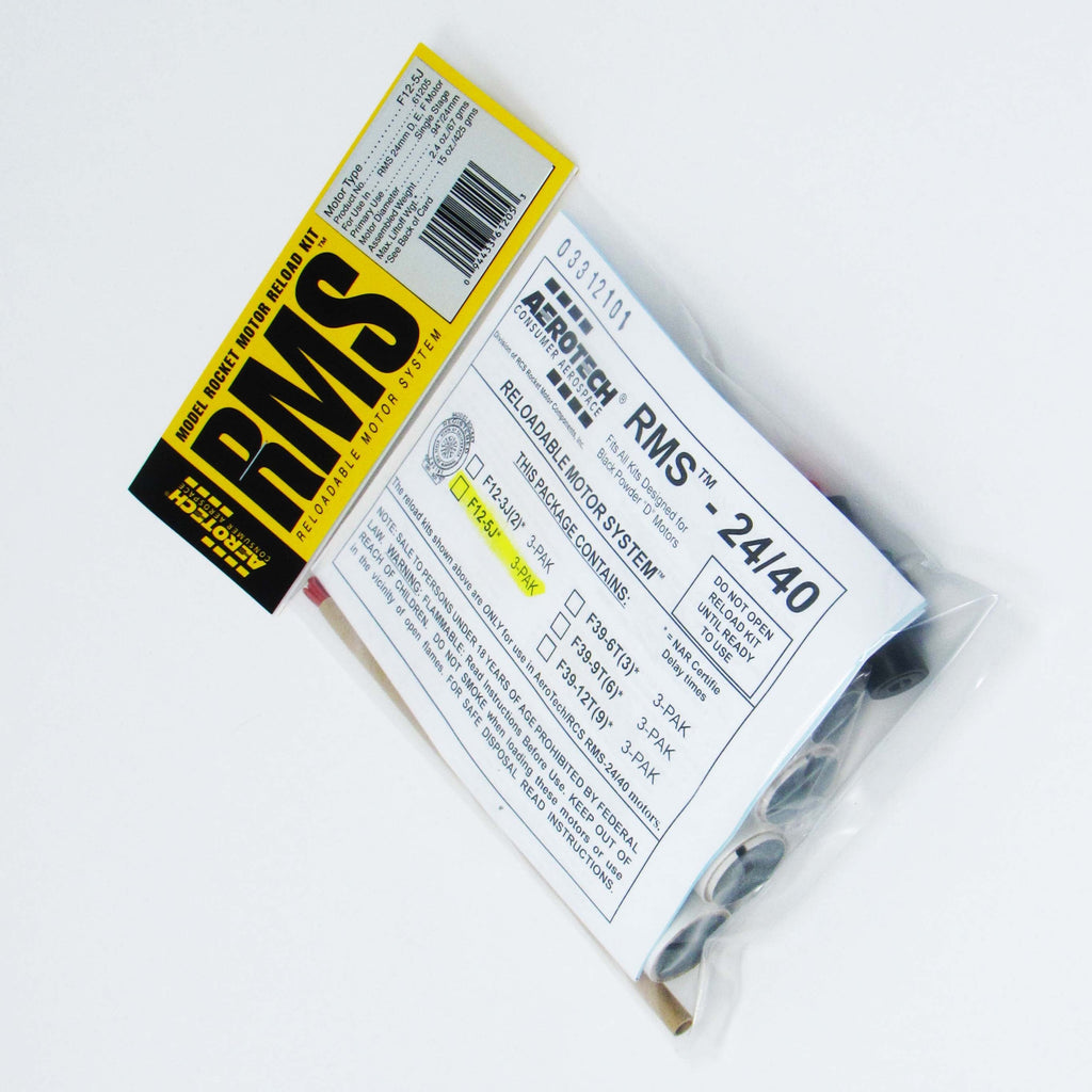 The AeroTech Reloadable Motor System RMS is an aluminum cased reusable motor in kit form that is assembled by the user. You will need AeroTech RMS-24/40 motor hardware to build and complete the motor for many reliable flights. Motor hardware is available separately in a complete set, and also as individual parts. Important: Mid Power RMS reload kits are not compatible with High Power RMS products. This RMS motor reload utilizes RCSs exclusive Black Jack™ aerospace grade composite propellant formulation, which produces a visible black exhaust plume and a denser dark tracking smoke. Black Jack™ motors provide a higher level of thrust than White Lightning™ motors of the same total impulse and are perfect for high lift-off acceleration.